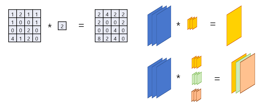 1x1 Convolution을 생각하면 이걸 왜 하느냐에 대한 의문이 생길 수 있습니다. 첫 그림처럼 1x1 Convolution은 scalar 곱이나 마찬가지이기 때문입니다. Filter의 채널이 증가해도 output channel은 filter의 개수가 결정하기 때문에 1채널짜리 output이 생기게됩니다. 즉 Filter의 수를 조절함으로써 output channel의 크기를 조절할 수 있다는 것입니다.