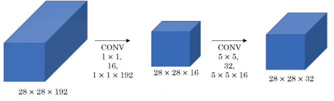 위 그림의 5x5 Conv를 진행한다고 생각하면 Computational cost는 28x28x32x5x5x192가 됩니다. 이는 단일 Inception 모듈중에서도 일부이기 때문에 적지 않은 비용입니다. GoogLeNet 은 이를 1x1 Conv로 해결합니다.
