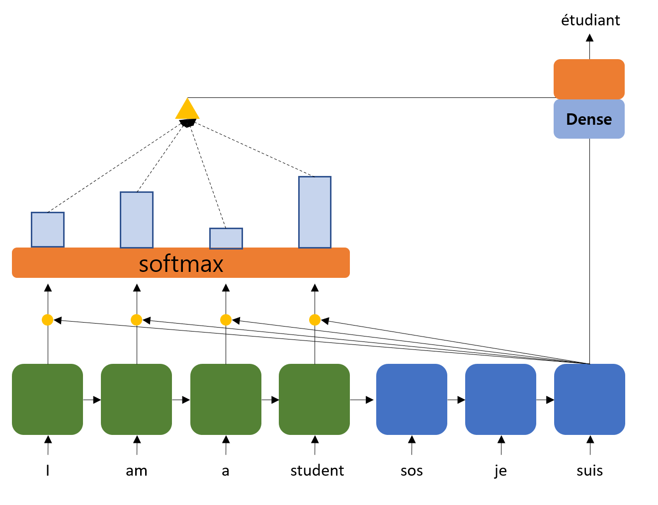 Attention 공부를 위해 여러 블로그를 참고했는데 그중 제가 그나마 이해하기 편했던 그림입니다. 'étudiant' 라는 단어를 만들기 위해선 디코더 부분의 hidden state \(s_{3}\)가 필요할 것입니다. 하지만 'Attention' 개념을 적용하면 디코더의 hidden state 뿐만 아니라 Encoder의 전체 입력 sequence를 참고합니다. 위 그림과 같이 \(s_{3})\와 인코더 부분의 각각의 hidden state를 dot-product 혹은 어떤 함수를 이용해 'Attention Score'를 생성합니다. Attention score에 softmax를 취한 후 인코더부 hidden state를 곱해 새로운 context vector를 생성합니다.