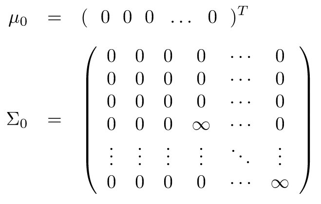 \(\mu \)은 로봇의 pose와 랜드마크의 위치정보를 의미합니다. 2D 환경에서의 SLAM을 가정하고 있기 때문에 \(\mu \)는 \(x,y,\theta \) 와 n개의 랜드마크의 \(x,y\)좌표를 갖고 따라서 \( 3+2n \) 의 벡터가 됩니다. 따라서 Uncertainty를 의미하는 Covariance matrix \(\Sigma \)는 \((3+2n)^{2}\) 크기의 행렬이 됩니다.