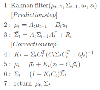 이 알고리즘의 목적은 \( t-1 \)에서 \( t \) 에서 control과 observation을 인풋으로 받아 다음 "Mean"과 "Uncertainty of Belief"를 구하는 것입니다.