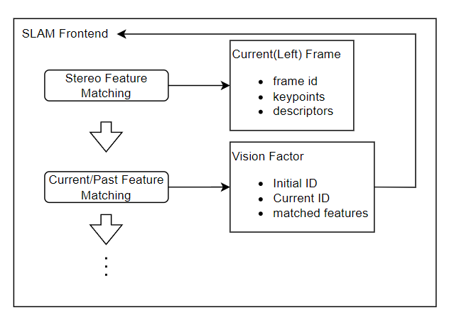Current, past frame간의 matching에선 한가지 정보를 더 저장하는데, 해당 feature가 언제 처음 보였는지, feature가 처음 추출된 inital frame ID를 저장해줍니다. Current, Past frame matching을 하기 위해서는 일정 개수의 frame을 저장하고 있어야하는데 예제 코드에서는 10개의 frame을 들고 있습니다. 이전 frame들과의 matching이 끝나면 SLAM frontend에 Vision Factor라는 데이터 구조로 정보를 넘겨주게 됩니다. 아래와 같이 현재 frame의 feature들과 처음 발견된 initial frame Id, 그리고 현재 frame Id를 저장합니다.