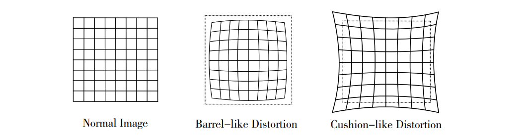 Barrel distortion causes a reduction in the radius of pixels as the distance from the optical axis increases, whereas cushion distortion results in the opposite effect. However, the line that passes through the center of the image and the optical axis remains unchanged in both distortions. Apart from the lens shape that leads to radial distortion, tangential distortion occurs during camera assembly because the lens and the imaging surface cannot be precisely parallel. The radial distortion is computed as: