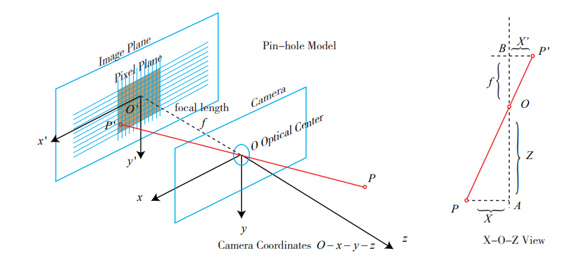 We will deal with the camera coordinate system in whuch the lens of the camera is the origin as shown in Figure 2. The figure shows how the point \(P[X,Y,Z]^{T}\) is projected on the image plane at point \(P^{\prime}\). By the similarity of the triangles: