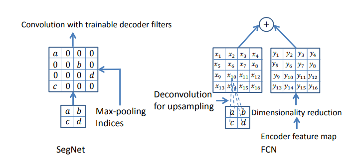 따라서 Downsampling을 하기전 boundary 정보를 저장할 필요가 있는데 만약 메모리가 충분하다면 feature map 자체를 유지하겠죠. 하지만 이는 비현실적이기 때문에 SegNet에서는 Max-pooling window 내의 가장 큰 값의 인덱스만 저장합니다. 2x2 max-pooling이기 때문에 1개의 window당 2-bit이 필요합니다.