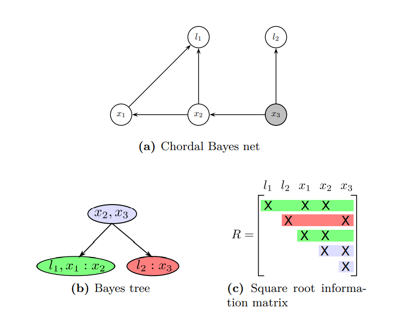 iSAM2에서 제안하는 data structure는 clique tree와 유사하지만 bayes tree는 directed 그래프이며 QR factorization의 결과에 좀더 fit 하다고 합니다.