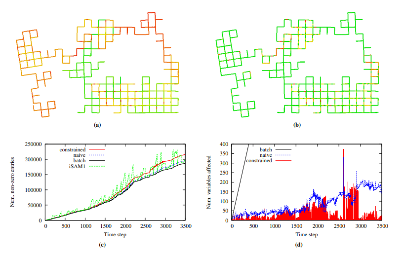 하지만 iSAM2에서 Bayes Tree Structure가 도입되면서 Variable Reordering 이 매 incremental update 마다 수행되도록 수정되었습니다. Bayes tree에서 새로운 measurement가 추가되면서 영향을 받는 clique node 개수가 대체로 적기 때문에 cost가 크지 않기때문입니다. 물론 전체 노드의 일부만 reordering 하는것은 optimal ordering에 멀어지지만 COLAMD와 비교해 경쟁력이 있다고 합니다.